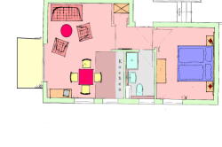 Kleine Maisonette (2 Personen, mit Aufbettung für maximal 2 Personen möglich ). Esszimmer mit Küchenzeile und Balkon, Schlafzimmer, Bad mit Dusche. Vom Esszimmer geht die Treppe in den Spitzboden zum Wohnzimmer (Maisonette – nicht überall Stehhöhe) mit großem Fenster. Ca. 59 qm